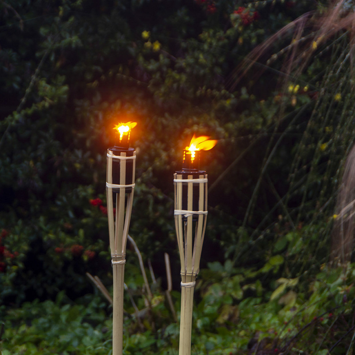 Creëer een gezellige sfeer in de tuin of op het terras met deze bamboe fakkel. De fakkel is gemakkelijk in de grond te steken.