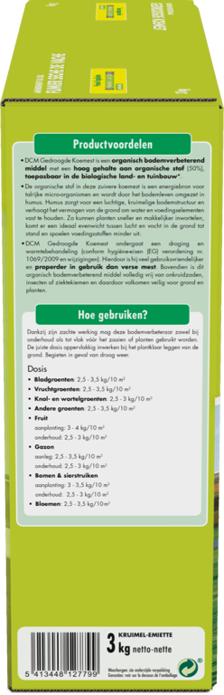 DCM Gedroogde Koemest is een bodemverbeteraar die de grond verrijkt met humus voor een betere structuur. Het is een gedroogd product, vrij van onkruidzaden, ziektekiemen en insecten en dus volledig veilig voor grond en planten. Gebruiksvriendelijker en schoner dan verse mest. Dosering 2,5 - 3,5 kg per 10 m². Toepasbaar in de biotuin.