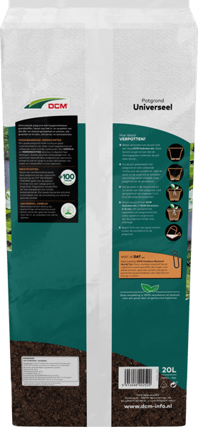 DCM Universele Potgrond is een uitmuntende potgrond met hoogkwalitatieve grondstoffen, ideaal voor het in- en verpotten van alle één- en meerjarige bloemen en planten, alle groenten en kruiden, alle terras- en kamerplanten. HOOGWAARDIGE VEENSOORTEN Een goede potgrond moet luchtig en goed waterdoorlatend zijn, maar moet tegelijkertijd ook voldoende water kunnen vasthouden. Een SOEPELE en VEERKRACHTIGE structuur is daarom heel belangrijk. Dankzij de juiste verhoudingen wit- en zwartveen behoudt deze potgrond zijn veerkracht, krimpt hij niet en zorgt hij ervoor dat planten vlot water en meststoffen kunnen opnemen. ORGANISCHE MESTSTOFFEN De toegevoegde meststoffen geven TOT 100 DAGEN VOEDING aan de planten en zorgen voor een rustige groei en lange bloei. Organische meststoffen zijn een energiebron voor talrijke bodembacteriën. Een goede bacteriële activiteit is onmisbaar voor de ontwikkeling van sterke en gezonde wortels. UNIVERSEEL GEBRUIK Deze potgrond kan dankzij zijn evenwichtige samenstelling zowel binnen als buiten gebruikt worden voor het in- en verpotten van allerlei planten.