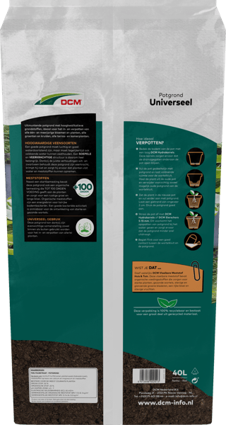 DCM Universele Potgrond is een uitmuntende potgrond met hoogkwalitatieve grondstoffen, ideaal voor het in- en verpotten van alle één- en meerjarige bloemen en planten, alle groenten en kruiden, alle terras- en kamerplanten. HOOGWAARDIGE VEENSOORTEN Een goede potgrond moet luchtig en goed waterdoorlatend zijn, maar moet tegelijkertijd ook voldoende water kunnen vasthouden. Een SOEPELE en VEERKRACHTIGE structuur is daarom heel belangrijk. Dankzij de juiste verhoudingen wit- en zwartveen behoudt deze potgrond zijn veerkracht, krimpt hij niet en zorgt hij ervoor dat planten vlot water en meststoffen kunnen opnemen. ORGANISCHE MESTSTOFFEN De toegevoegde meststoffen geven TOT 100 DAGEN VOEDING aan de planten en zorgen voor een rustige groei en lange bloei. Organische meststoffen zijn een energiebron voor talrijke bodembacteriën. Een goede bacteriële activiteit is onmisbaar voor de ontwikkeling van sterke en gezonde wortels. UNIVERSEEL GEBRUIK Deze potgrond kan dankzij zijn evenwichtige samenstelling zowel binnen als buiten gebruikt worden voor het in- en verpotten van allerlei planten.