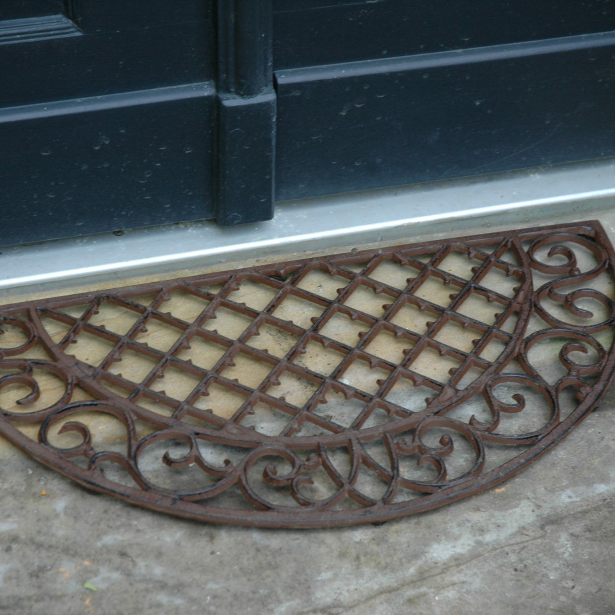 Deze halfronde gietijzeren deurmat zorgt voor een klassieke entree. De mat heeft een Victoriaans patroon met sierlijke krullen en is per stuk met de hand gegoten volgens eeuwenoud vakmanschap en traditie.